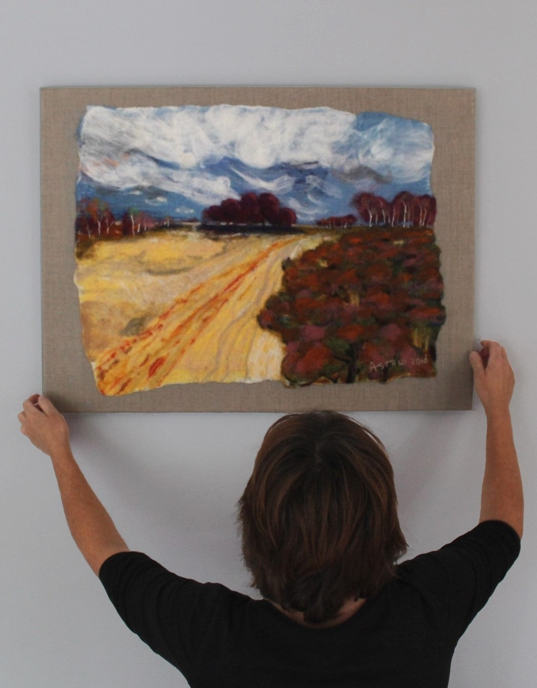 Als textielkunstenaar maar ik schilderijen van wol. Tijdens het maak proces meng ik kleuren en textuur. Ik maak met wol mijn eigen doek en bewerk deze met allerlei textiel materialen tot een afbeelding. Een tijdrovend en arbeidsintensief proces, maar voor mij de manier om mijn liefde voor de natuur en historie uit mijn omgeving weer te geven.